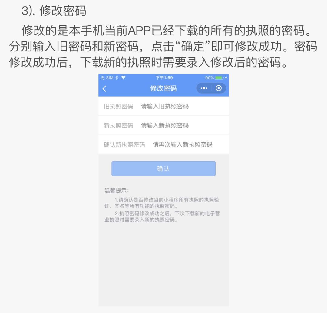 执照空间主要有本机执照,挂失执照,修改密码,删除执照等操作。